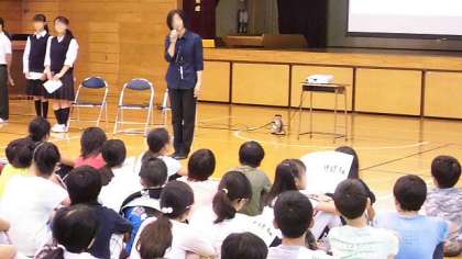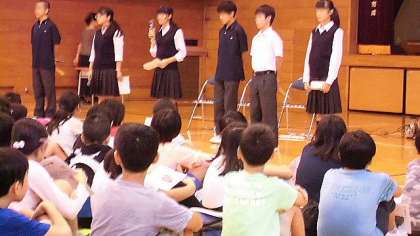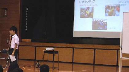 体育館で最初に中学校の先生からのお話を聞いた後、生徒会役員の生徒から、スライドを使って中学校生活についての説明がありました。スライドは生徒会役員の皆さんが自作したものです。さすが中学生!わかりやすい説明に感心しました。質問にもていねいにこたえてくれました。