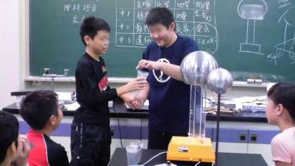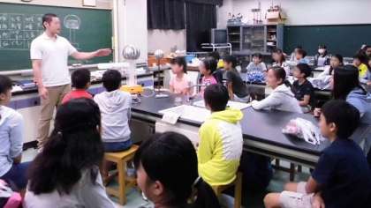 中学校の生活についての説明の後は、クラスごとに中学校の先生による模擬授業をうけました。本校3クラスは、英語、国語、理科の授業です。写真は理科の授業の様子です。中学校理科学習の概要についての説明の後、静電気の実験を中心とした授業を受けました。大きな静電気発生器や、ビリッとくる静電気の体験を、楽しんでいた子どもたちです。
