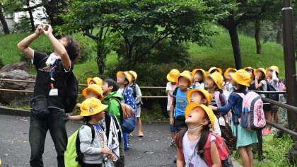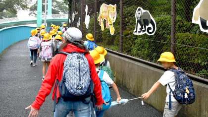少し離れた駐車場から歩いて動物園に向かいました。途中、野生のリスが頭上の木の枝にいて、それを見つけて子どもたちは大喜びです。ちなみにこのリスは外来種のタイワンリスで、神奈川県では増えているそうです。横浜の中心部から近いここでも見ることができるとは思いませんでした。