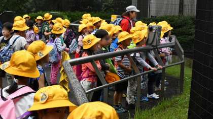 どんよりした転機でしたが、愛想よく動物が迎えてくれました。歓声を上げながら見学する子どもたちです。