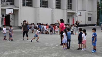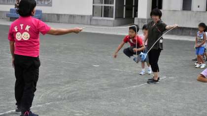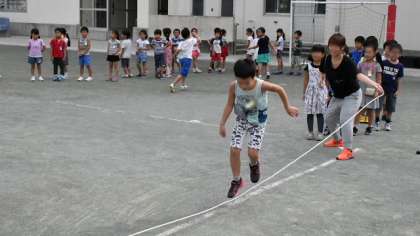 27日(火)、1・2年生が体育朝会で、長なわ跳びをしました。1学期から始めた1年生ですが、以前に比べてしっかり跳べる子がふえてきました。