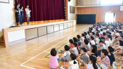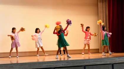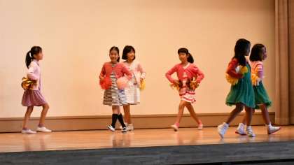 6日(木)朝の集会は、集会委員会企画の「かくし芸大会」です。集会委員会が募集して参加が決まった5グループが、とっておきの芸を披露しました。最初は3年生5人組のダンスです。ポンポンを手に、曲に合わせかわいらしい動きです。
