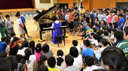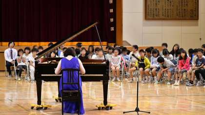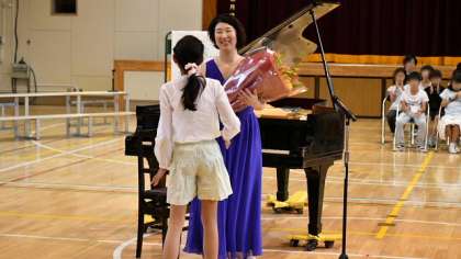 エチュードの時には、ピアノの周りに集まって、間近でピアノの演奏を見て、子供たちも大感激です。最後に児童代表から花束を贈り、ピアノコンサートは終了しました。子供たちのとってよい経験となりました。