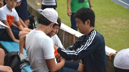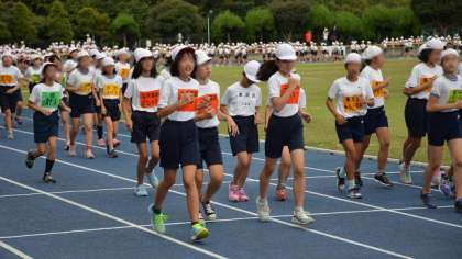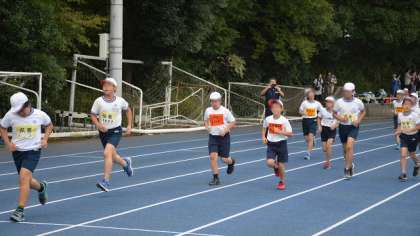 最初に、一周400mのトラックを皆で走って足慣らしです。陸連の公認トラックの走り心地はやはり違いますね。観覧席にもどって出番に備えます。外れてしまったゼッケンを縫ってあげている担任のようすです。