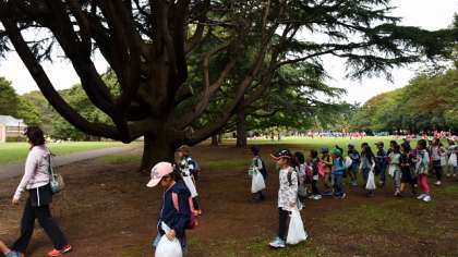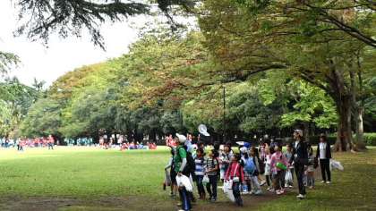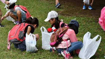 夢中になってドングリや落ち葉をひろったり、虫取りをする子供たちです。