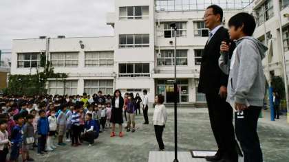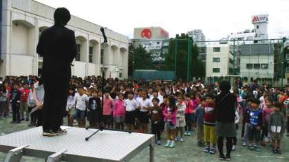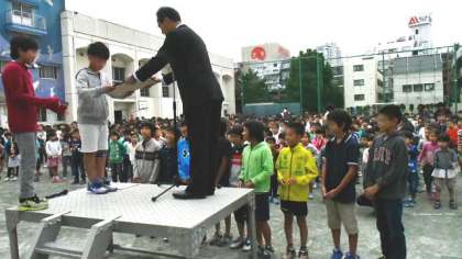 24日(月)朝会は校庭で行いました。どんより曇り空でしたが、子供たちの元気なあいさつでスタート。校長講話の後、今木曜日から世田谷区小学生海外派遣団「オーストラリア、バンバリー派遣団」に本校代表として参加する5年生が出発のあいさつをしました。続いて先日の大会で優勝したサッカー部の5・6年生を表彰しました。いろいろな場面で活躍する本校児童。うれしいですね。