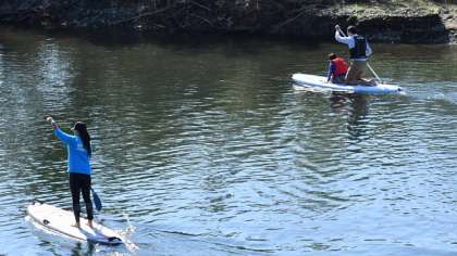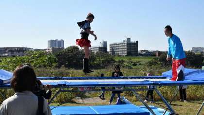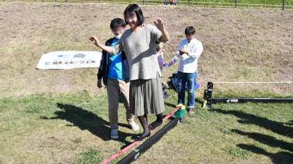 リバーフェスタには、川を生かしたスポーツや、普段あまり経験出来ないスポーツの体験コーナーがあって、参加した児童や本校教員も楽しんできました。綱渡りのような「スラックライン」は、本校でも導入を検討しているところです。