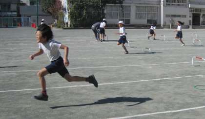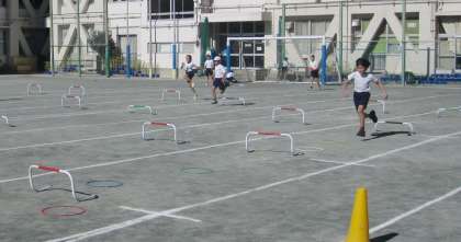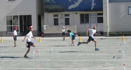 「小型ハードル走」の学習をしています。一定の間隔に並べられた小型ハードルを今日は、3歩のリズムで走り超えることをめあてに取り組みました。チームごとに自分たちでタイムを計ったり、アドバイスし合ったりしながら自主的に学習を進めていました。