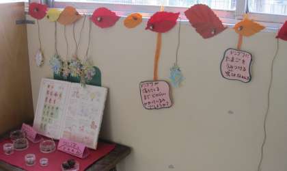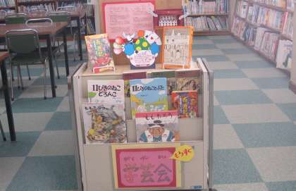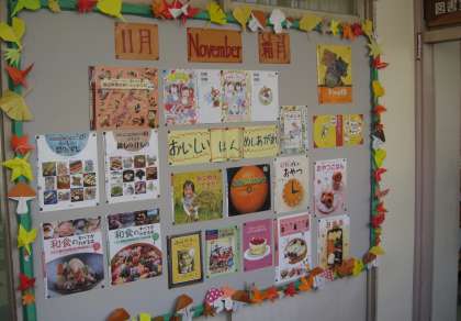 今年度より、学校支援コーディネーター(図書担当)が中心となり、二子玉川小学校図書ボランティアを組織し、活動を続けています。活動の一環として、学校図書館の環境整備を行っています。子どもたちが、本を手に取って読みたくなるような工夫がたくさんあります。今月は、実物と図鑑を一緒に展示したり、学芸会台本の原作本を紹介したりしています。図書館入り口の掲示板は、季節に合わせて飾りつけがされています。