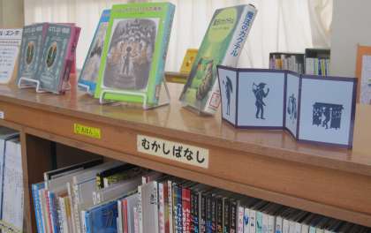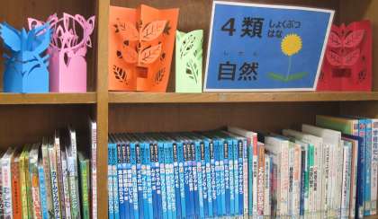 書架は、本の分類に合わせて、切り紙で装飾されています。ちょっとした心遣いが感じられ、心が温まります。保護者の図書ボランティアの活動は、子どもたちの読書活動に大いに役立っています。いつもありがとうございます。