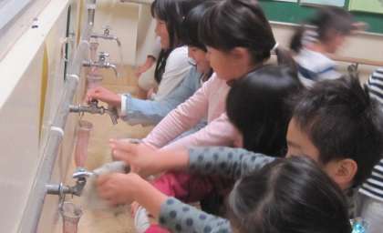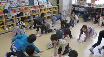 今日は、雨が降っていて、とても寒い日でしたが、清掃の時間は、冷たい水でも嫌がらずに一生懸命雑巾しぼりをしていました。床の乾拭きは、並んでみんなで協力して行いました。