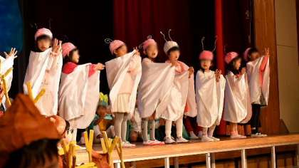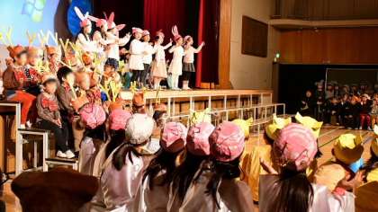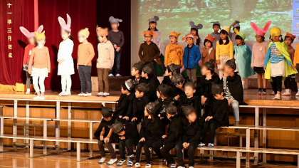 学芸会の練習風景、写真は1年生です。グループごとに衣装や小道具が分かれていて、元気にセリフを言っていました。