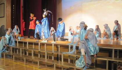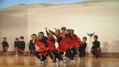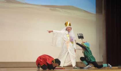 4年生の劇は「孫悟空」です。舞台背景が完成し、衣装を着て、本番さながらの練習をしています。歌あり、踊りあり、仕掛けありの迫力のある舞台です。演技を盛り上げる効果的な音響は、子どもたちが担当しています。