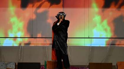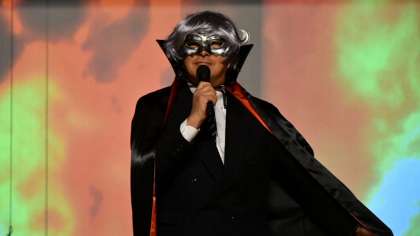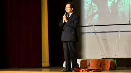 3学年ずつの演目の合間、休憩の後に、私も登場させていただきました。「演劇の神」?に扮しました。