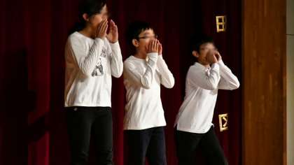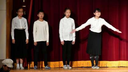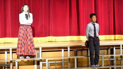 6年生の演目は「モモと時間どろぼう」です。町外れの円形劇場跡に迷い込んだ不思議な少女モモ。そこへ「時間どろぼう」の魔の手が忍び寄ります。