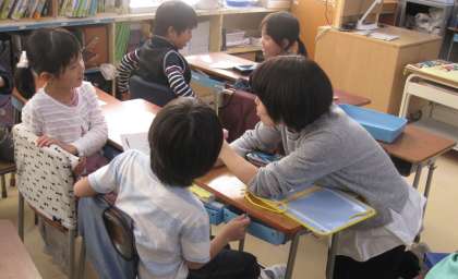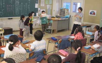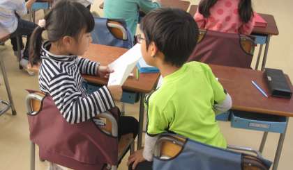 「ねえ、どっち?」これは、教材名です。自分の考えに理由をつけてお話をします。「空を飛べるほうき」と「体を見えなくするマント」のどちらが欲しいかを選び、理由をワークシートに書きました。それをもとにして、隣の席の友達とペアで発表し合い、自信がついたところで、全体の場で発表しました。