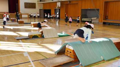 8日、1年生体育の授業のようすです。跳び箱の学習です。勢いよく両足で踏み切って、跳び箱に両手をついてしっかり支え跳び越す練習です。跳び箱の置き方や長さをマットなどを使って段階的に設定し、それを経験していくうちに、自然にしっかり跳び越すことができるように工夫していました。楽しくできることが大事です。