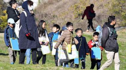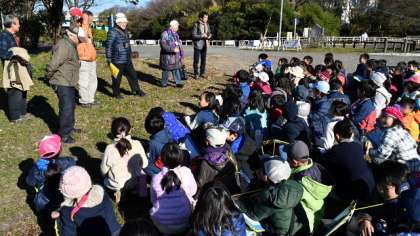 10日土曜授業日、2年生が多摩川河川敷、兵庫島公園に出かけて、探鳥会を行ってきました。土曜日とあって、保護者のお手伝いの方も多数参加していただきました。講師は、城南教育支援サークルのみなさんです。講師の先生方とあいさつをして、さっそく探鳥会の開始です。
