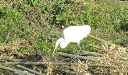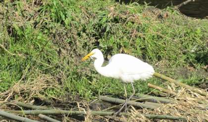 「口ばしの色が黄色だから、この鳥は、大サギです。でも夏は、黒い色をしています。」と子どもが教えてくれました。図鑑で調べて覚えたそうです。目の前で大サギが魚を狙っています。素早い動きで見事に捕えました。子どもたちは熱心にカードに記録していました。
