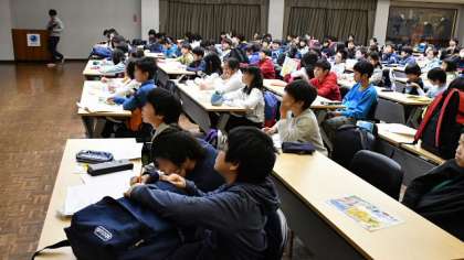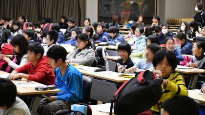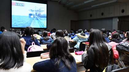 製鉄所を見学する前に、案内の係の方から、ホールでお話を聞いたり、鉄ができるまでのビデオを見たりしました。みんな真剣に学習していました。