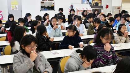 昼食の後は森永製菓鶴見工場の見学です。ホールに到着してすぐ、ミルクココアを試飲しました。外ですごして冷えた体に、暖かなココアはありがたかったです。その後、お菓子ができる過程を、ビデオを見て学びました。