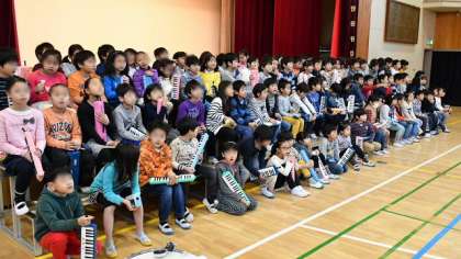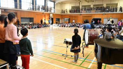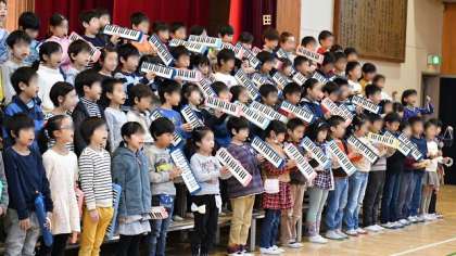 16日(金)、音楽朝会は2年生の発表をしました。冷え込みが厳しい中、体育館に一足早く集合して練習をすませた2年生。そこに全校児童と参観の保護者・家族のみなさんが次々と集合してきます。2年生は歌と合奏のコラボレーションと合唱を披露しました。