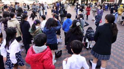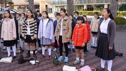 18日(日)、世田谷区の小学校のうち、合唱部の活動をしている学校が一堂に会して、「合唱交歓会」が、世田谷区民会館で開催されました。本校合唱団も午後の部に参加しました。本番前に区民会館前の広場で発声練習をしました。