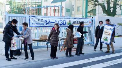 4日(土)午後3時から、「ゾーン30」の3周年を記念した活動を行いました。まず最初に東門で、キャンペーン活動です。地域、PTAの方々と本校からも親子連れで一組が参加し、チラシを配り声かけをして、通りかかる車の方に「ゾーン30」をアピールしました。※「ゾーン30}:広範囲な地域を制限速度キロメートルに指定して、交通事故防止につとめる取り組みです。本稿の学区では玉川3・4丁目全域が指定されています。玉川地区は、地域提案型で実現した初めてのケースです。