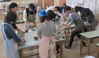開始1時間前。うどん作りのそれぞれの過程を経て、試作品が完成しました。初めて体験した教員もいて、楽しみながら取り組みました。