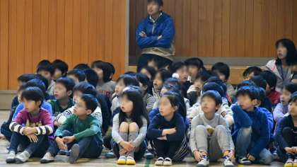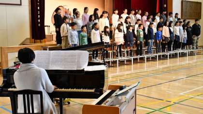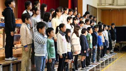 2月28日、体育館で音楽朝会を行いました。この日は本校の合唱団の発表です。本校合唱団は、週2回、朝練習を行い、先日の区の「合唱交歓会」と都の「合唱祭」に出演し、高い評価を得ました。この日の歌声もとてもすてきで、場内の児童を魅了しました。