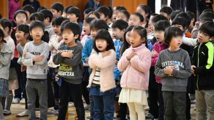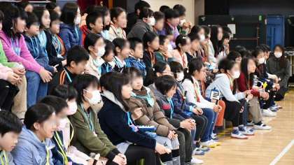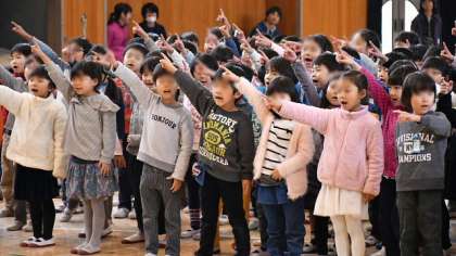 1年生をじっと見守る6年生に、PPAPの替え歌と、「世界に一つだけの花」の替え歌のプレゼントです。