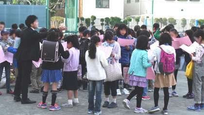 登校してきた子どもたちは、昨年度の担任が待つ校庭へ。新2年生から5年生まで、新学年のクラス名簿が配られました。