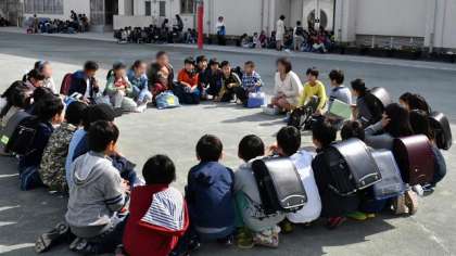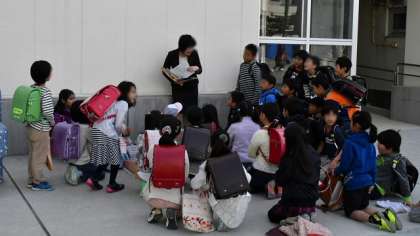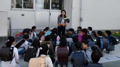 始業式の後、3,4,5年生は、担任の周りに集まって話を聞きました。