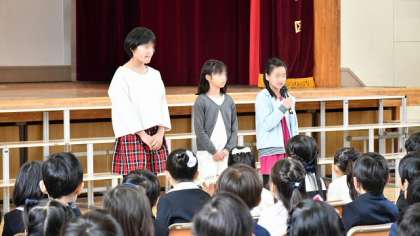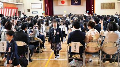 6年生からお祝いとはげましのことばを贈り、6年生全員と参列の皆さんとで、校歌を歌い、無事盛大に入学式は終了。1年生が堂々と退場しました。