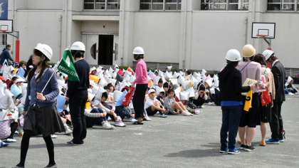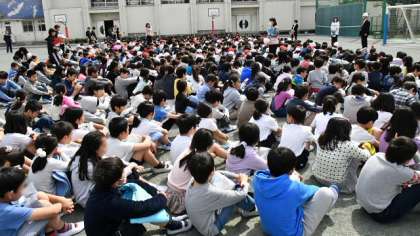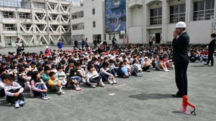 基本的な避難のしかたを再確認したこの日の訓練。子どもたちも教員も新学期始まって間もないこともあり、若干戸惑う様子もありましたが、1回目としてはとてもよい訓練ができました。