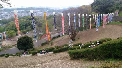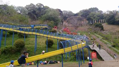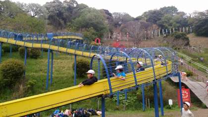 動物園に行く前に、遊具で遊びます。長い長いローラー滑り台です。