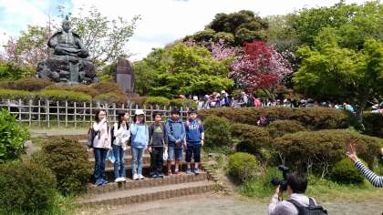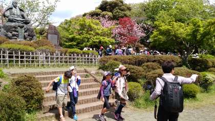源氏山公園の頼朝像前で、グループごとに記念撮影をして、ハイキングスタートです。ハイキングのゴールは、鎌倉大仏です。このあとゴールまでは、しばらく速報はお休みです。