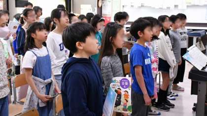「授業紹介」として、様々な授業のようすを写真で紹介していきます。音楽の歌唱指導のようすです。歌詞の意味を考え、それにあった歌い方を工夫して進めていきます。