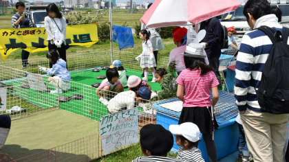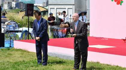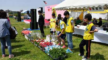 午前10時に、多摩川河川敷の兵庫島付近で開会式が行われました。本校卒業生の瀬田中学校生徒もボランティアで参加していました。