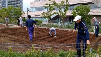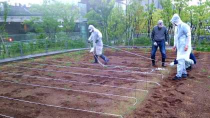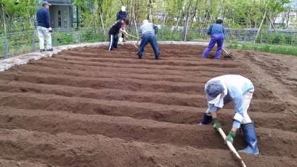 5月1日、小雨が降りしきる中、2年生が11日サツマイモの植え付けをするため、ライスの屋上菜園の整備をしました。今年度から地域の団体「銀雄クラブ」の皆さんに支援をいただくことになりました。この日も2年生担任に先だって土の掘り起こし作業と畝作りをしてくださいました。これで準備万端です。
