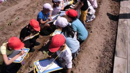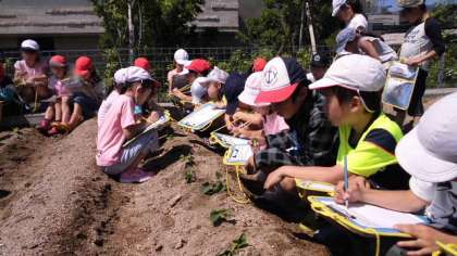 以前お知らせしたように、今年度から「銀雄クラブ」の皆さんの援助をいただき、畑の準備から、この日のお手伝いもしてもらいました。苗を植え付けた後は、しっかり観察をしました。