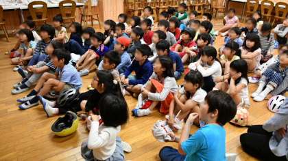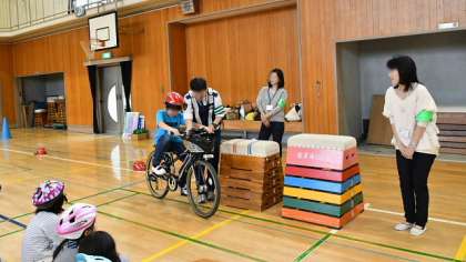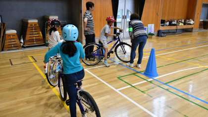 自転車は保護者の方のご協力で学校にもってきていただき使用しています。この日はあいにくの雨模様の天気で、校庭で予定していたのを体育館に移動しての実施となりました。
