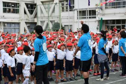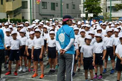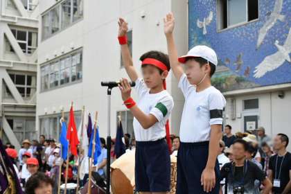 代表委員がスローガンの発表と宣誓を行い、運動会の歌をで開会式の終了です。さあいよいよ始まります。