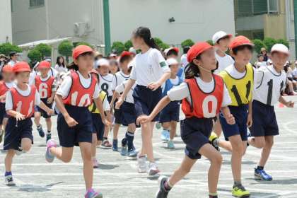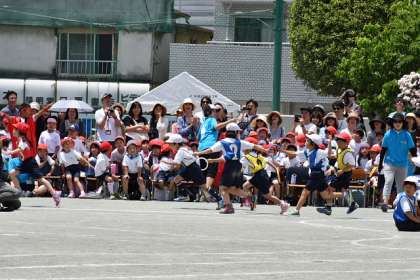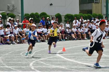 午前中の最後の種目、1・2・3年選抜選手による、低学年紅白リレーです。ゼッケンは赤組が赤と黄色、白組が白と青です。1・2年生は校庭半周、3年生は一周しバトンをつなぎます。
