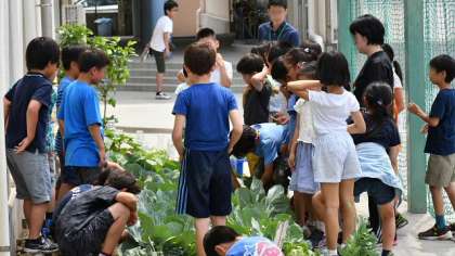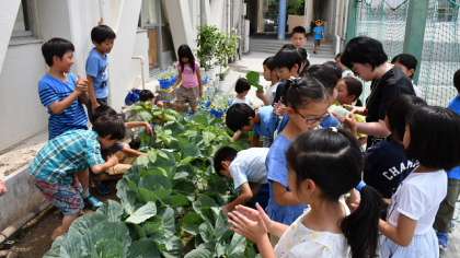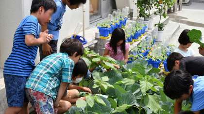 3年生は理科で虫の飼育活動をしています。主にカイコの飼育をしているのですが、それと比較する形で、モンシロチョウやアゲハチョウの飼育にも挑戦しています。校舎も南側に植えてあるキャベツを調べて、モンシロチョウの幼虫や卵を探していました。上手に探せた子は「名人」としてみんなから認めてもらって、その探し方をみんなに伝授していました。
