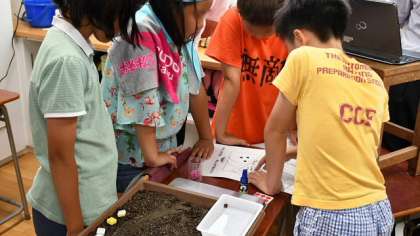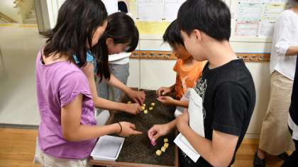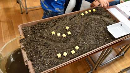 モデル実験は、二子玉川近くの多摩川の流れと近くの建物を模した装置に、水量が多くなったときに街を守るための堤防を想定したおはじきをセットし、水を流して街を守れるかどうか試してみる実験です。