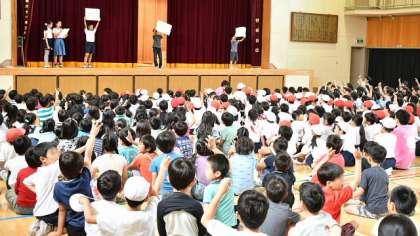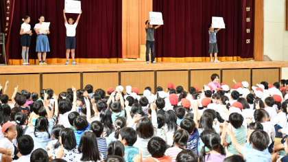 8日(木)朝、体育館で児童集会が行われました。集会委員会企画・運営で、これは何でしょうクイズです。舞台の幕をわずかだけ開けて、その隙間を通ったものが何なのか当てるクイズです。幕の間を通り過ぎる間一瞬見えるものを、何なのか特定するのは難しいので、三択問題にしました。