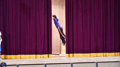 プラスチックゴミ箱、ヘルメット、黒板消しなどが、問題として出されました。子どもたちは一瞬に目をこらして見つめて、クイズを楽しんでいました。最後の問題は、一瞬通り過ぎる先生を当てるクイズです。舞台裏では、教員が台の上に乗り、反対側にあるエバーマットに決死の覚悟で飛び込んでいました。