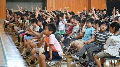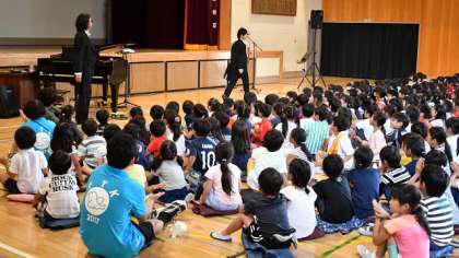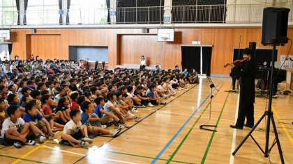 6月19日、体育館にバイオリンとピアノデュオの「スギテツ」さんをお招きして、音楽鑑賞教室を行いました。クラシック音楽を親しみやすいかたちにして演奏するグループで、テレビ番組にも出演されている方々です。