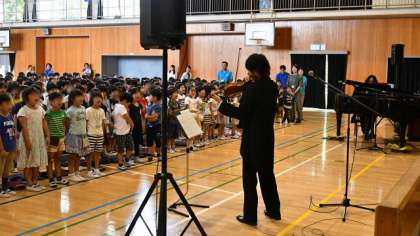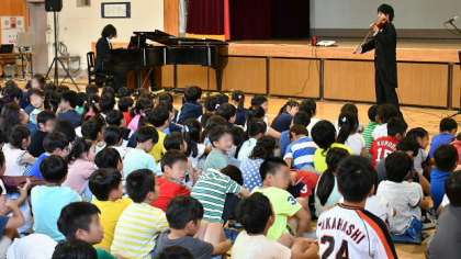 クラッシック音楽というと、ハードルが高いように感じますが、演奏された曲には耳になじんだものも多く、会話をはさんで1時間ほどの楽しいコンサートとなりました。最後には校歌を演奏していただき、一緒に歌いました。